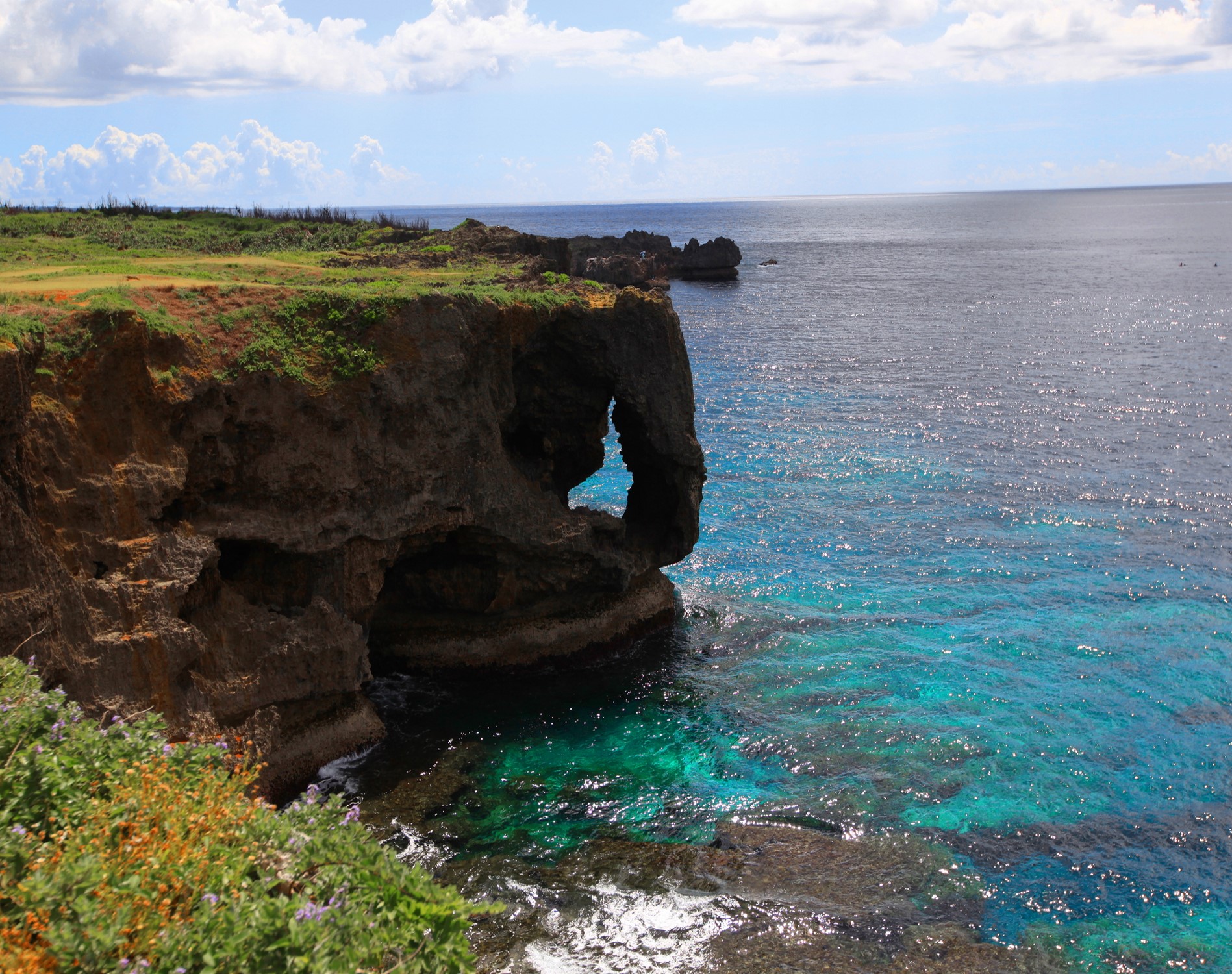 -the rock formation is like an elephant with it’s trunk in the ocean which is located near Onna Village
