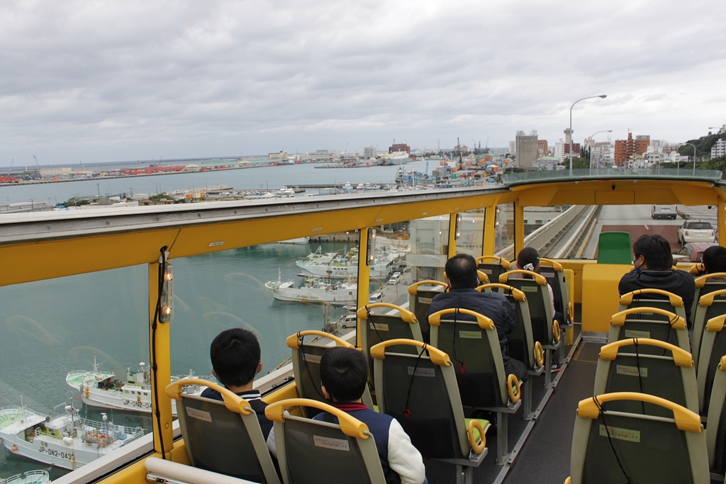 ~車窓をお楽しみください:ウミカジテラスがある「瀬長島」一周→全国でも有数の利用者数を誇る「那覇空港」→奇跡の1マイルと呼ばれ、600以上の店舗がありデパート・レストラン・雑貨店・お土産屋・ディープなショップなどの観光客を対象とした多くの店でにぎわう「国際通り」~