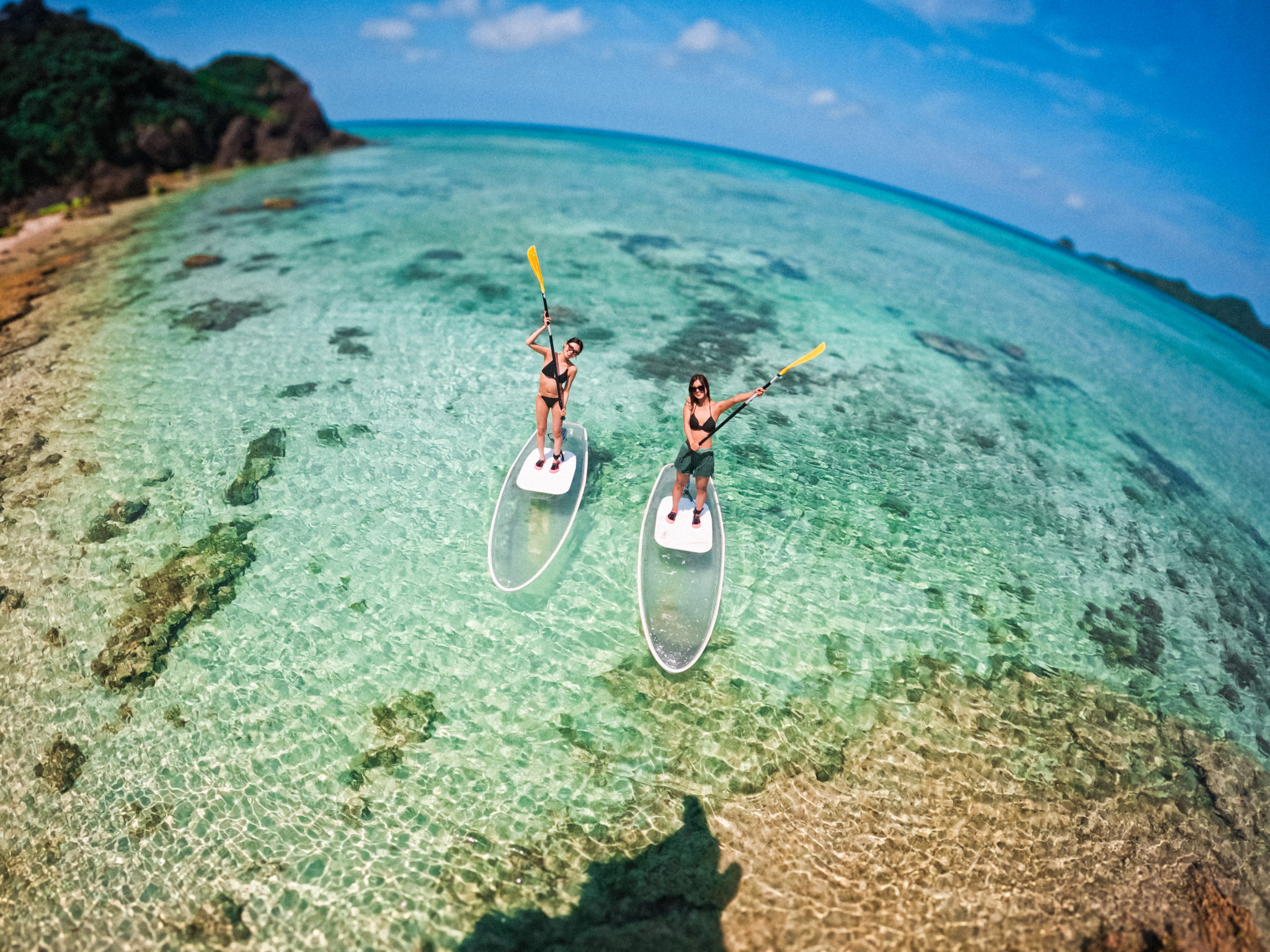 Enjoy breathtaking aerial views of Ishigaki Island’s crystal-clear waters while cruising on a clear SUP, captured by drone!