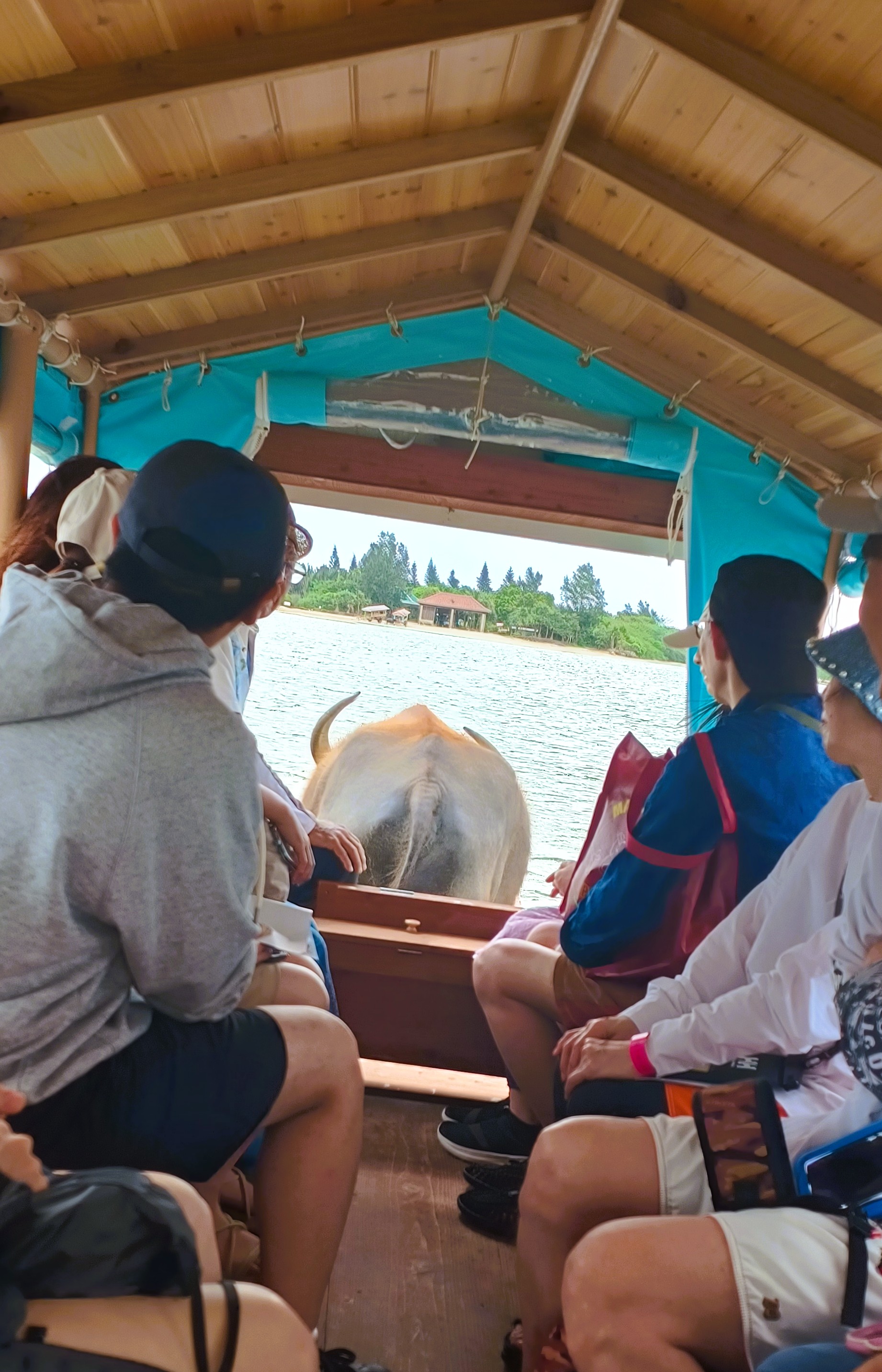 물소수레를 타고 얕은 바다를 천천히 건너 유부섬으로 향합니다.
